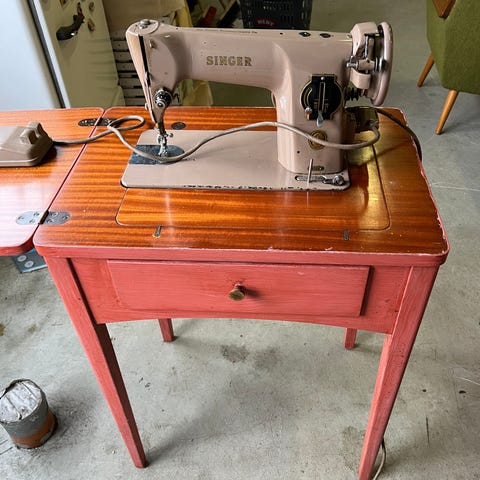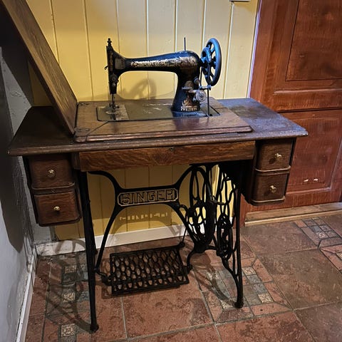 Singer symaskin, vintage modell med manuell håndsveiv. Maskinen har dekorative detaljer og er montert på en trefotplate. Egnet for håndsøm og reparasjoner, uten elektrisk motor.