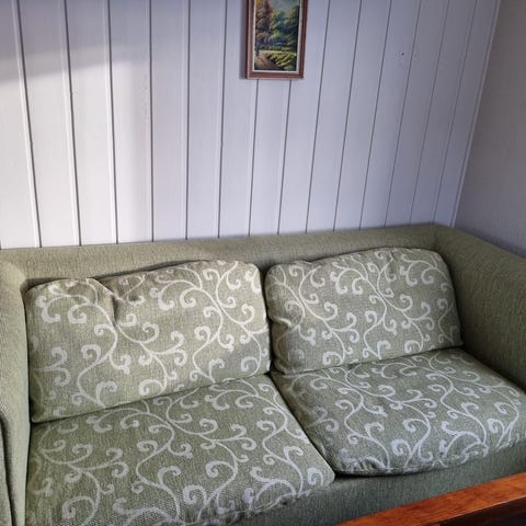 Merk også bilde av hullet på den ene stolen, mulig dette går an å reparere med nål og tråd?!