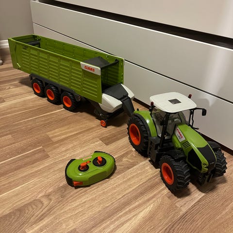Bruder traktor med tilhenger og fjernkontroll. Leker for barn som inkluderer en grønn traktor med hvit førerhytte, grønn tilhenger og en fjernkontroll. Passer til lek og simulering av landbruksarbeid.
