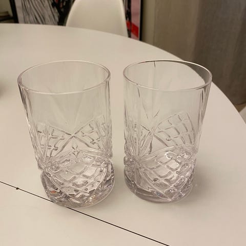 Tre høye glass fra IKEA og fire melkeglass fra Rosendahl gis bort. Et lite skår i to av Rosendahl-glassene.