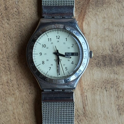 Swatch herre klokke med blå urskive og flere funksjonelle underskiver. Klokken har en lenke i stål med lukking. Designet for menn med et robust og funksjonelt utseende.