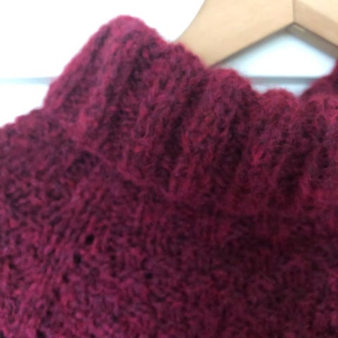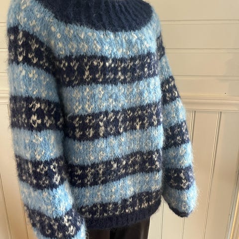 Pent strikket genser med 3/4 puffermer. Strikket i Drops ullgarn, kanskje cloud. Lite brukt, i størrelse M, passer også str s. Mål: ermer 30 cm, hel lengde 55cm og brystmål 100cm.