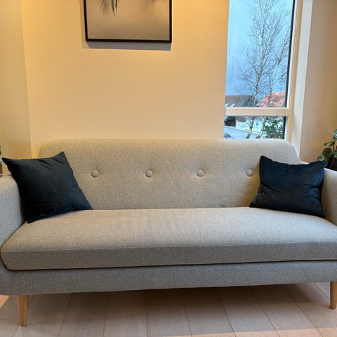 Selger to 3- setere i tidløst design. Sofaene er trukket med slitesterkt ull og har god sittekomfort.
