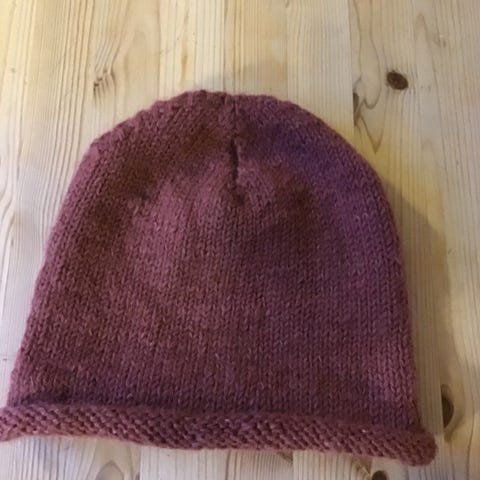 To hjemmestrikka luer, strikket i en tråd merinoull, og en tråd kid silk mohair. En i voksenstørrelse, og en i barnestørrelse.