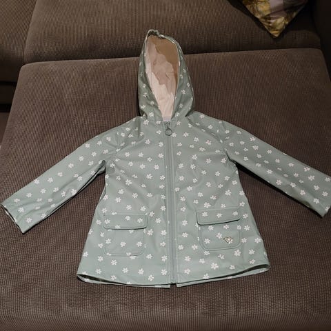 MINI A TURE barnejakke i størrelse 98, designet for jenter. Jakken er grønn med et blomstermønster og laget av polyester. Den har hette og lukkes med glidelås. Jakken er egnet for utendørs bruk og gir beskyttelse mot vær.