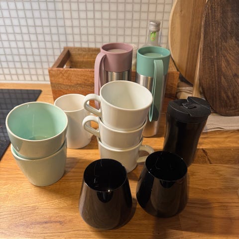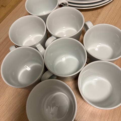 Sett med espressokopper og skåler. 6 av hver. Blåvfarvet. Pent brukt. Hentes i Oslo.