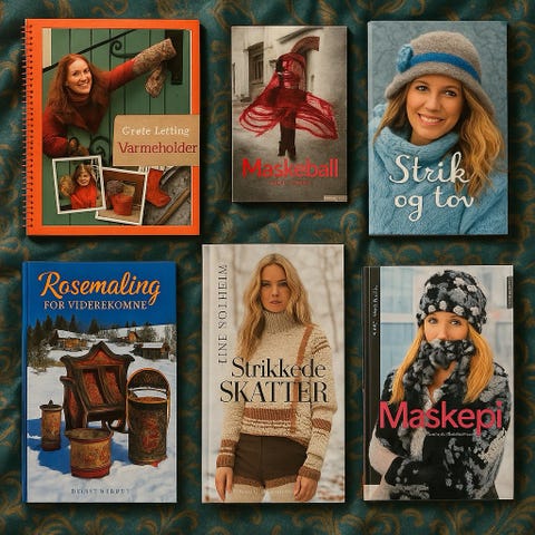 Mange flotte håndarbeidsbøker selges til nye hjem. De fleste ser helt nye ut, og er såvidt åpnet. Det er strikking, hekling, patchwork og applikasjon. Bøkene er komplett med oppskrifter og mønsterark.