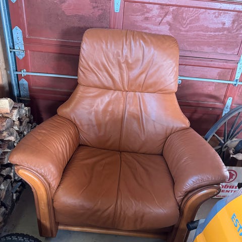 Ønsker å selge skinnstolen min da den ikke passer så godt inn i ny leilighet. Det er en solid og god stol som kan legges helt ned, og den kan svinge rundt.