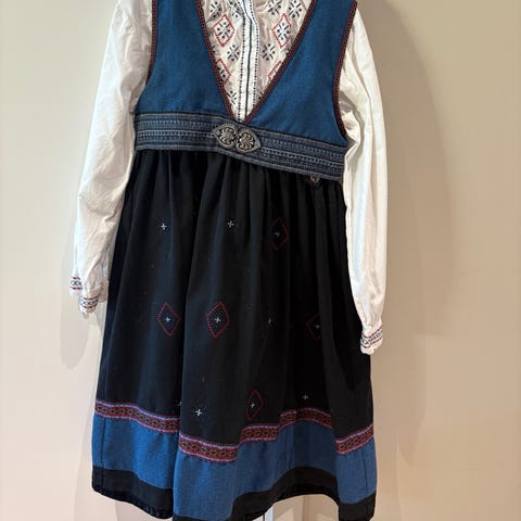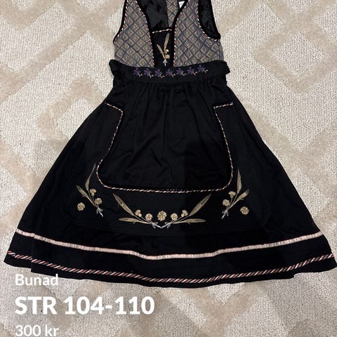 Lindex barn bunad i flerfarget polyester, størrelse 104, designet for jenter. Bunaden inkluderer en hvit skjorte (str110/116), rød og svart liv med broderte blomsterdetaljer, og et hvitt forkle. Egnet for tradisjonelle anledninger og festbruk.