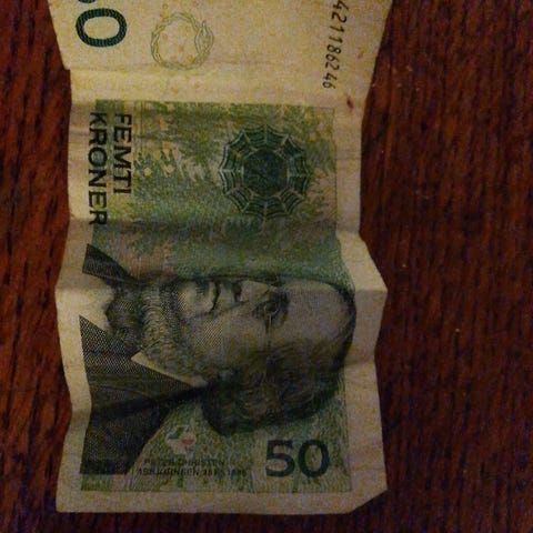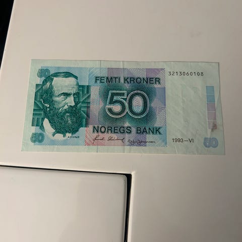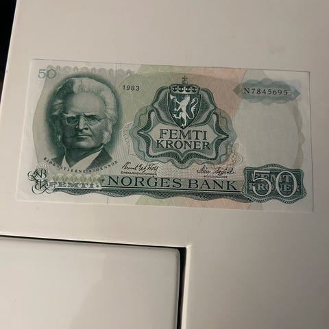 Norsk 50-kronesedler, papirvaluta brukt i Norge. Sedlene er grønne med ulike sikkerhetsdetaljer og portrett av en historisk person. Passer til samling eller valutaveksling.