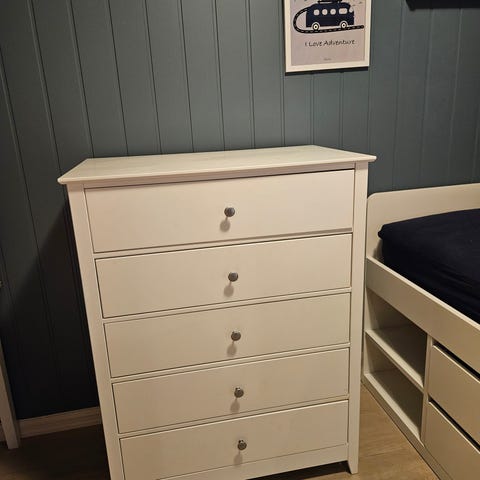 Pen kommode til salgs. Kjøpt på Finn.no for noen måneder siden, men passet ikke inn hos oss. Pusset opp av tidligere eier med en kombinasjon av lakk og maling. God plass i fire romslige skuffer. Øverste skuff har to indre kammer til for eksempel nøkler og lignende.