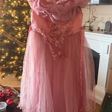Jeg tror det står størrelse 52 på kjolen, lappen er litt slitt og vanskelig å lese.