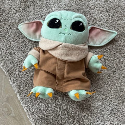 Star Wars Grogu kosedyr med beige klær og stor hette. Laget for barn og samlere, egnet til lek og dekorasjon.