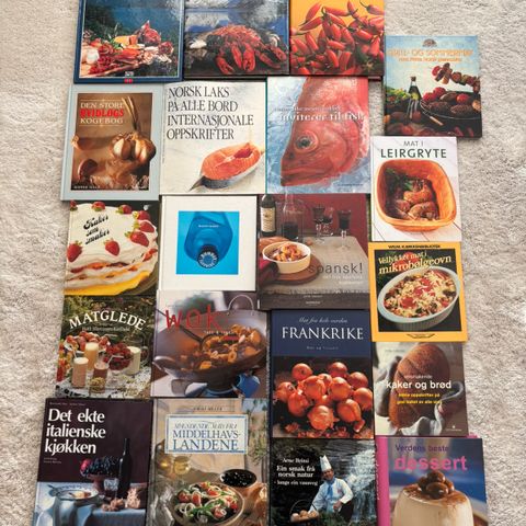 Flere kokebøker med ulike temaer og oppskrifter. Inkluderer bøker om mat fra India, Frankrike, Italia, og Thailand, samt kokebøker som 'Restekjærlighet' av Sara Heilmann & Klaus Descher, 'The Flying Culinary Circus', og “Stiansen Inviterer til Fest”.