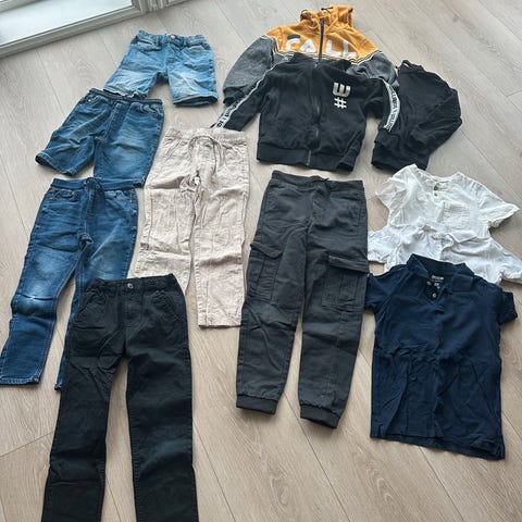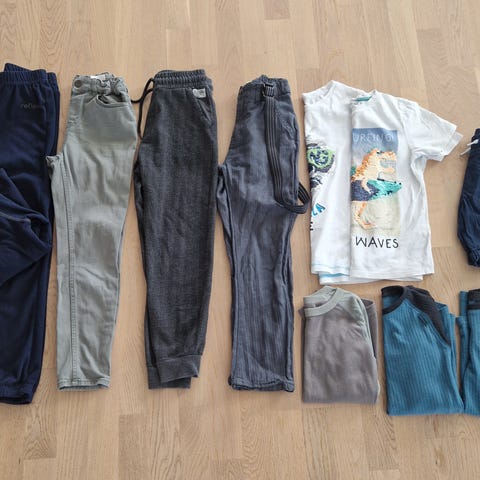Skjorte, finbukse, bukse, 5 tskjorter, 3 gensere, 2 shorts, 2 sett uv-klær.