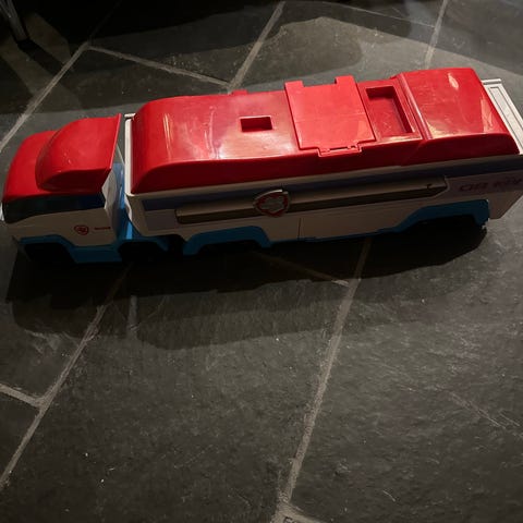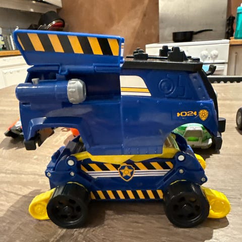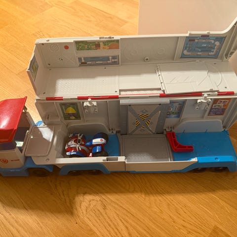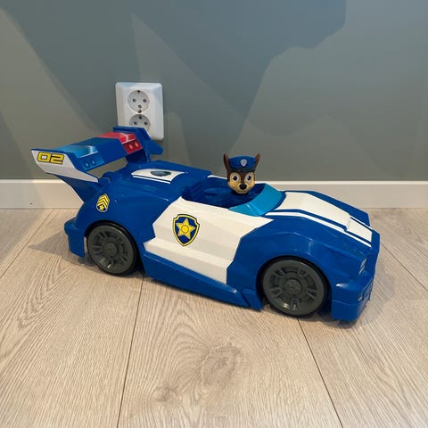 Paw Patrol lekebil med lys, blå og gul farge. Inkluderer en liten figur av en karakter fra serien. Laget av plastmateriale. Egnet for barn som liker lekebiler og Paw Patrol-tema.