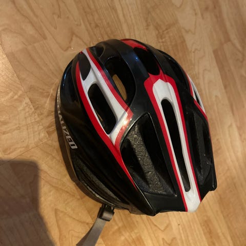 Specialized Sykkelhjelm i grønn og hvit farge. Hjelmen har flere ventilasjonsåpninger og justerbare stropper for passform.