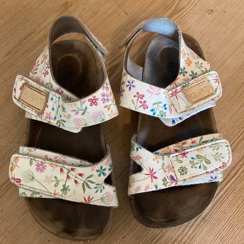 Kavat barnesandaler i størrelse 26. Normal til noe romslig i størrelsen. Lukket tå og mye mønster på undersiden, så godt grep og perfekt for aktivitet og lek. Pent brukt en sommersesong. Noe bruksmerker på utsiden, men svært lite slitasje på sålen.