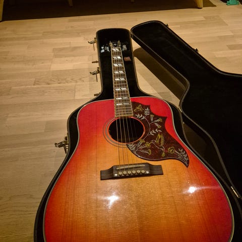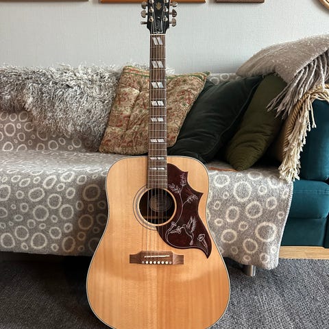 Har en Gibson Hummingbird Pro i svært god stand. Dette er en kvalitetsgitar med klassisk Gibson-lyd og komfortabel spillefølelse, perfekt både til fingerspill og komp.
