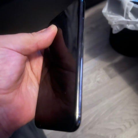 iPhone Xs med 256GB lagringskapasitet og 76% batterikapasitet. Bakskjermen har noen kosmetiske sprekker som ikke påvirker telefonen eller kameraets funksjon.