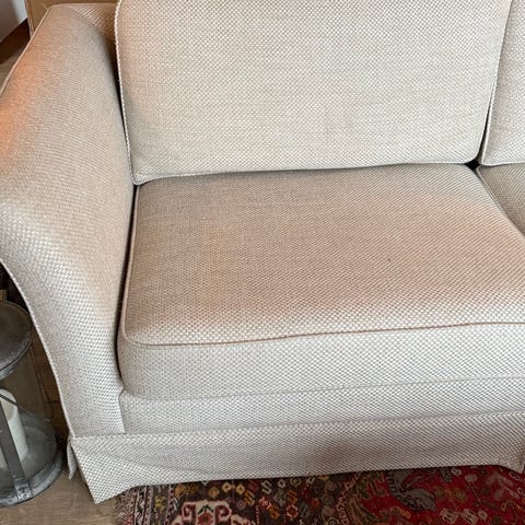 Sofaen er i god stand, men stoffet er merket av tidens tann. Ingen hull, men stoffet er falmet. Trekk på pute og madrass kan tas av og vaskes i maskinen.