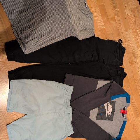 Pakke med herreklær i størrelse M, egnet for ulike sportstyper. Inneholder flere plagg i ulike farger og materialer, inkludert hettegensere og gensere med glidelås. Klærne har forskjellige design og detaljer, tilpasset sport og fritid