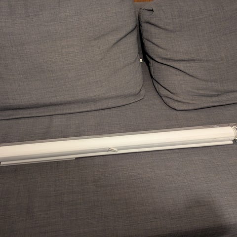 Pent brukt, dvs hengt opp og tatt ned en gang. Bredde 140cm og lengde 175 cm. Farg lys grå.