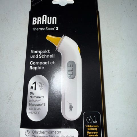 Ny pris 349KR. Mål temperaturen raskt og skånsomt hos nyfødte og voksne med Braun øretermometer som husker din forrige måling og har en feberindikator med lyd. Hygieniske engangshetter lett finnes på nett.