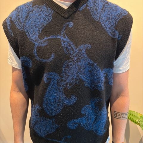 Samsøe Samsøe herrevest i svart farge, laget av ullmateriale. Vesten har størrelse S og er egnet for menn. Den har en ribbestrikket tekstur og V-hals.