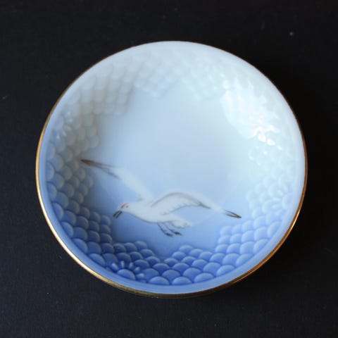 Liten blå hattevase H: 7 cm D: 12 cm. Syremerket PLUS BM i bunn. I fin stand.