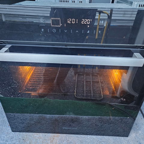 Varmluft ovn med svart finish. Innebygd design med ovnsrister og tre stekebrett. I tillegg føler det med tempratumåler til kjøtt ol. Som kan kobles til ovnen.