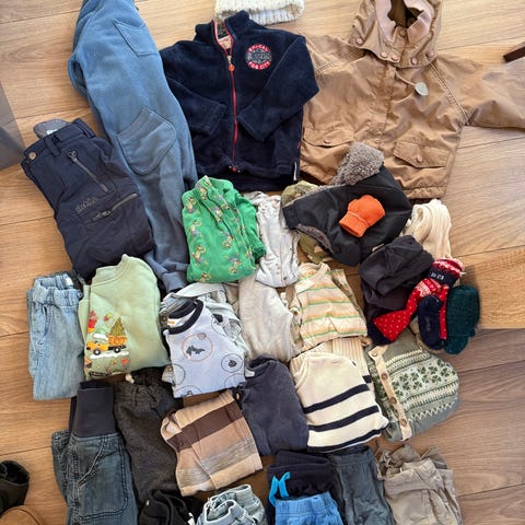 Klespakke med fire plagg, en kortermet body fra newbie, en lagermet body med bamse fra kappahl en bukse med striper fra kappahl og en genser fra newbie, alt str 86😍🐻