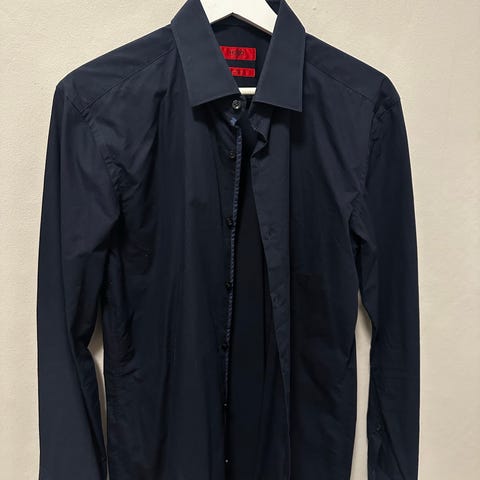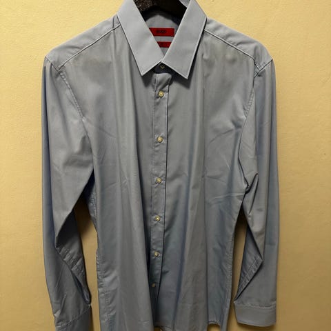 Hugo Boss skjorte i blå farge, størrelse M, laget av bomull. Skjorten har et rutemønster og er designet for menn.