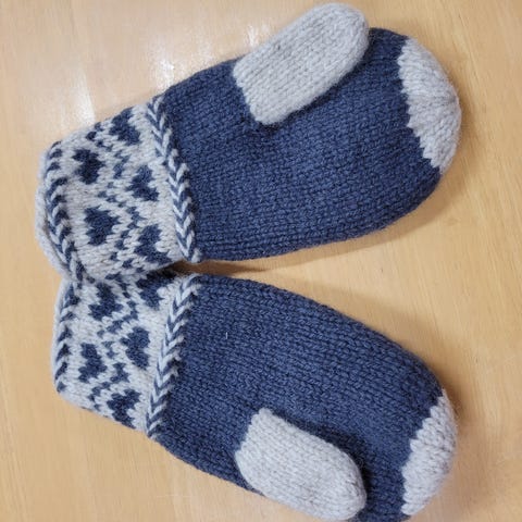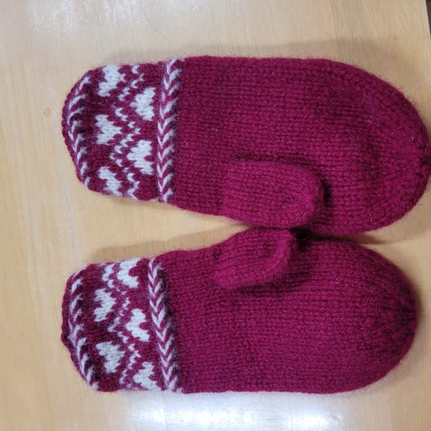 Størrelse ca 8/9. Kan toves så de blir mindre. Strikket i Sandnes fritidsgarn.