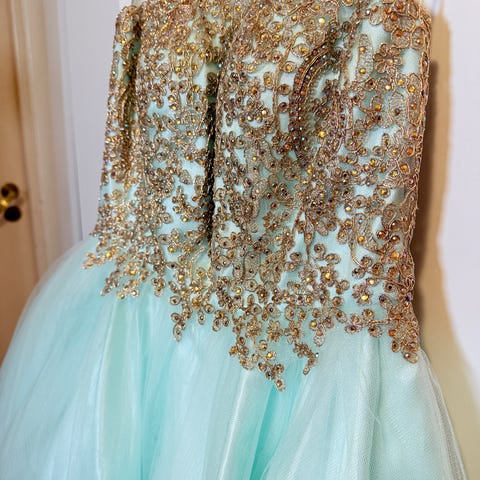 Nydelig kjole. Str 38, knitringen i ryggen gjør at den kan passe for flere størrelser. Kjolen er lagt opp til en som er 165 cm.