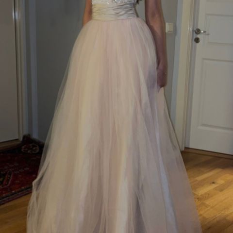 Vakker klassisk ballkjole som er helt ubrukt, i beige chiffon. Åpen rygg med utsmykking. Kjolen er en XS (32/34).