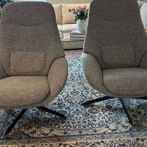 Vi selger 2 stk strøkne Bolia Sion Snurrestol med puff i lyst skinn fra 2017. Veil pris pr sett i 2017 var 33.000,- Selges for kr 9.000 pr sett eller 16.000 samlet Kan sees, handles og hentes på Nærsnes i Asker. - sendes ikke