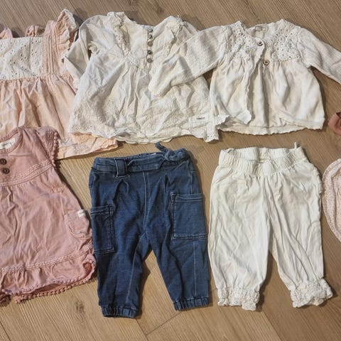 Bodyen med blonder og blomster, samt bodyen fra Noa Noa og buksen med kanin på rumpa er i str 62, resten i str 68.