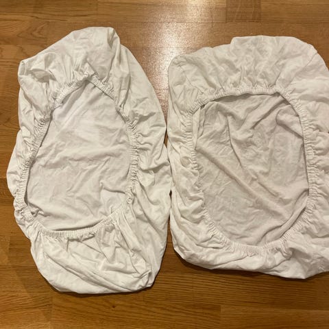 En pakke med formsydde laken til vogn eller vugge/bedside crib selges. Bomull. Ca. størrelse er 40x80cm. 1 x hvit i flanell.1x hvit jersey, 1x striper, 1x hvit jersey med skyer, 1x rosa jersey.