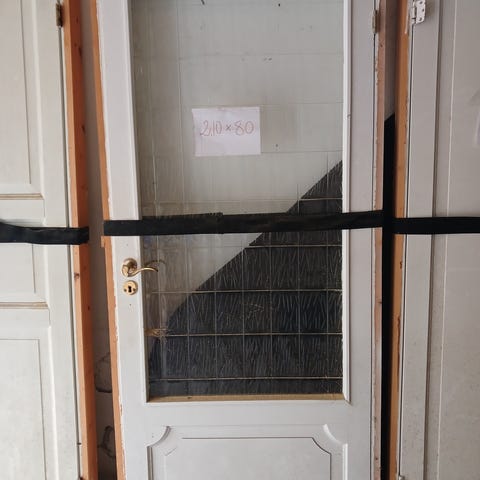 Dør i tre med tre . Rammen rundt er malt i rødbrun farge, mens glasspanelene har en lysere farge. Passer til innendørs bruk. Hel tre dør