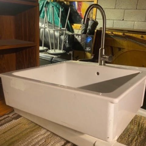 Servant i hvit porselen med kran i krom. Selges som den er mot henting.