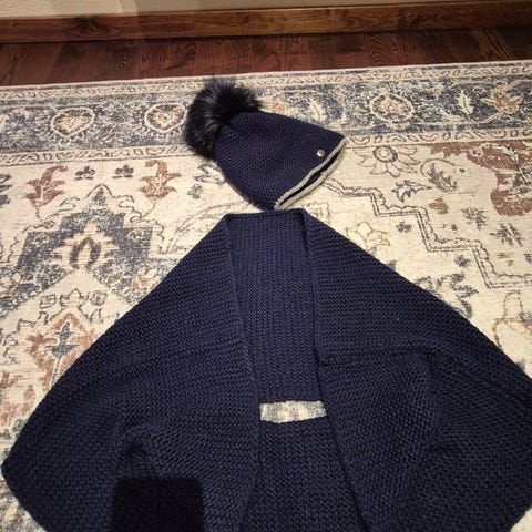 1 buff, 1 fleecejakke, en hjemmestrikket hals (grønn), 1 grå lue, 1 Bula pannebånd, 1 burgunderrødt skjerf, 1 hjemmeheklet skjerf i alpakka (mørkegrønn)