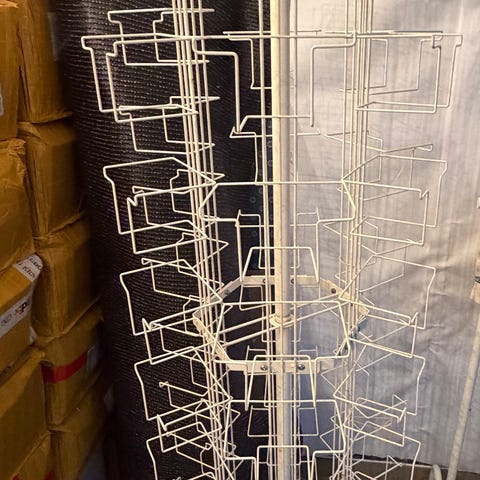 Roterende display stativ laget av stål med flere kurver for oppbevaring eller visning av små gjenstander. Stativet har en stabil base med fem hjul for enkel flytting og plassering.