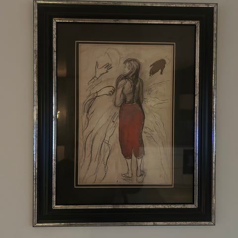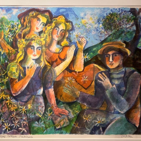 Håndlaget broderi i nydelig romantisk motiv og duse sarte farger. Bilde er brodert i bittesmå korssting og svært pent og nøye utført. Utrolig mange timer brukt her. Bilde er rammet inn på rammeverksted. Bilde har passepartout. Mål m ramme: 53x 63 cm. Bilde er helt strøkent - kun et par små striper på rammen. Gjør ingenting for helhetsinntrykket. Kan sendes. Kjøper betaler frakt.