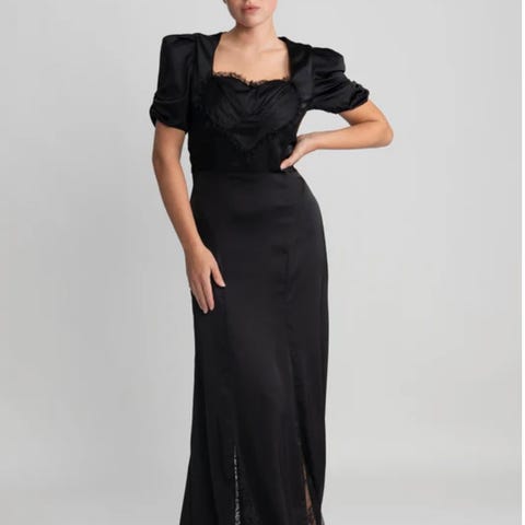 Kjolen har korte puffermer og V-hals med krage med blondedetaljer og sløyfe. Den har draperinger i midjen og knappelukking foran.