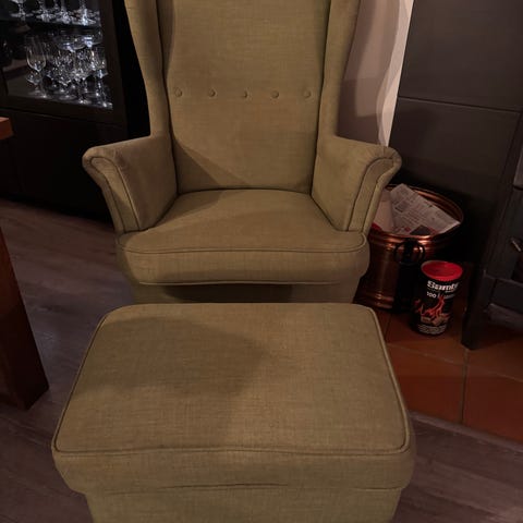 Brukt IKEA Strandmon grønn stol og fotskammel. Ca 9 år gammel. Noe slitt og løse tråder. Hund og katt har ligget i stolen.