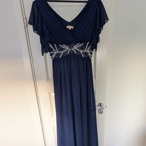 After Label kjole til spesiell anledning i blå farge, størrelse 40 for kvinner. Laget av akryl materiale. Kjolen har dekorative broderier på ermer og utringning.