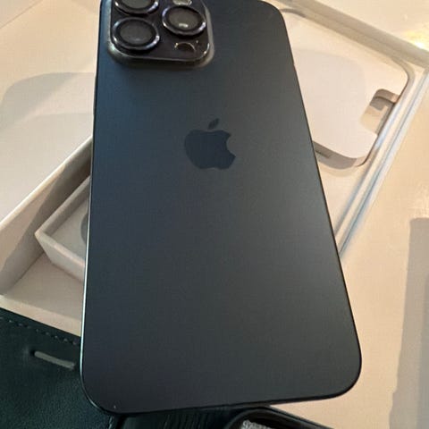 Apple iPhone 15 Pro Max mobiltelefon med 256 GB lagringskapasitet. Enheten har en svart farge og er utstyrt med trippel kamera på baksiden. Modellen tilbyr stor skjerm og høy ytelse.