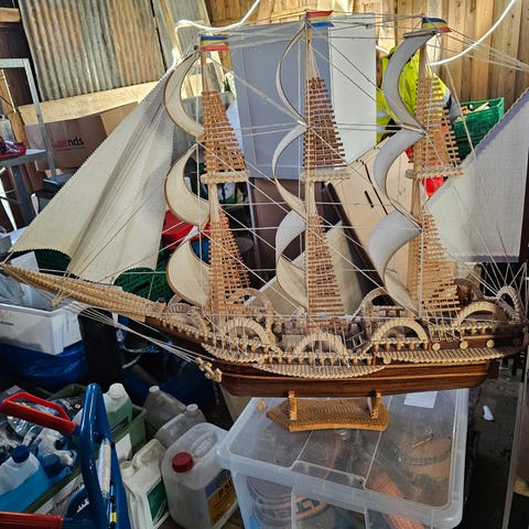 Modell båt i tre til pynt. 80cm lang, 82cm høy, 23cm bred. Må hentes