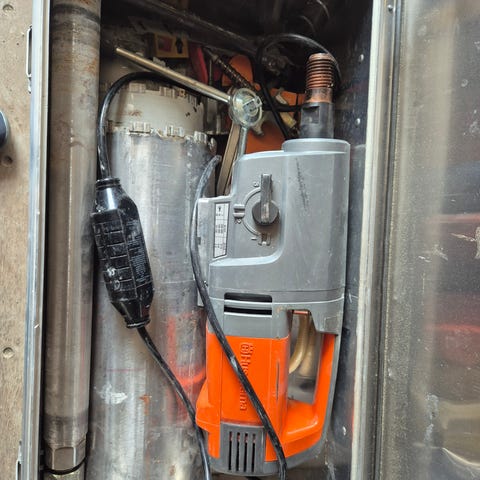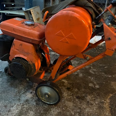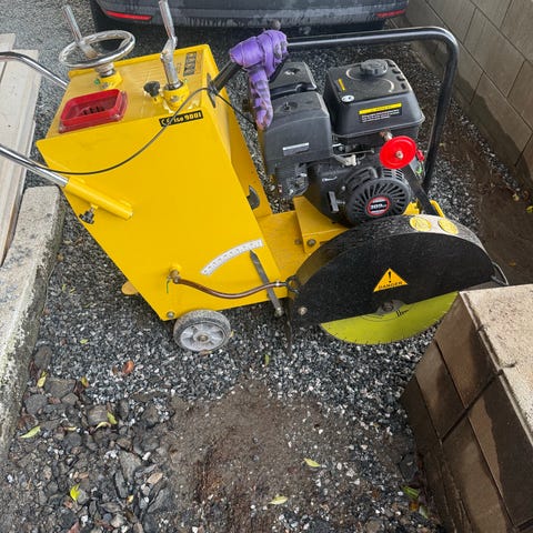 Asfaltsag / betongskjærer med bensinmotor. Maskinen har hjul for mobilitet og er egnet for skjæring i betong. Passer til bruk i byggeprosjekter og anleggsarbeid.